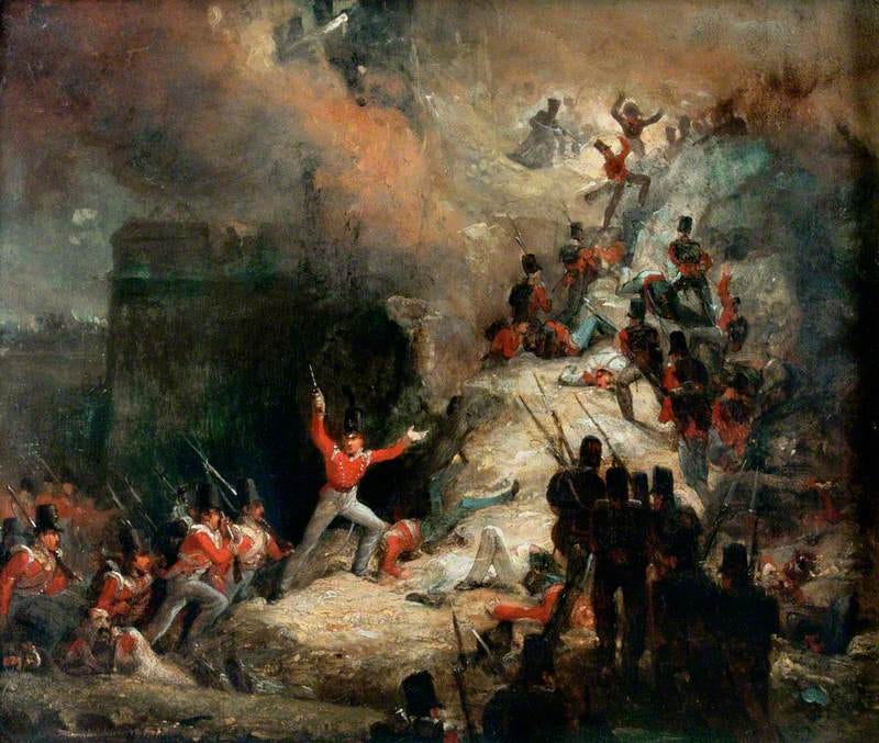 My favorite is “I left my legs / In Badajos’s breaches,” playing on breeches as pants and breaches as breaks in the fortress walls during the 1812 Siege of Badajoz, Wellington’s bloodiest capture of a Spanish town. “Pay her his devours, / When he devoured his pay” relies on a mangling of the French word from which came the English expression “pay one’s devoirs,” meaning to visit to pay one’s formal respects to someone. Robert Smith Surtees in his 1838 Jorrocks’ Jaunts and Jollities makes the same pun: “You must pay your devours, as we say in France, to the ’am, for it is an especial fine one, and do take a few eggs with it.”