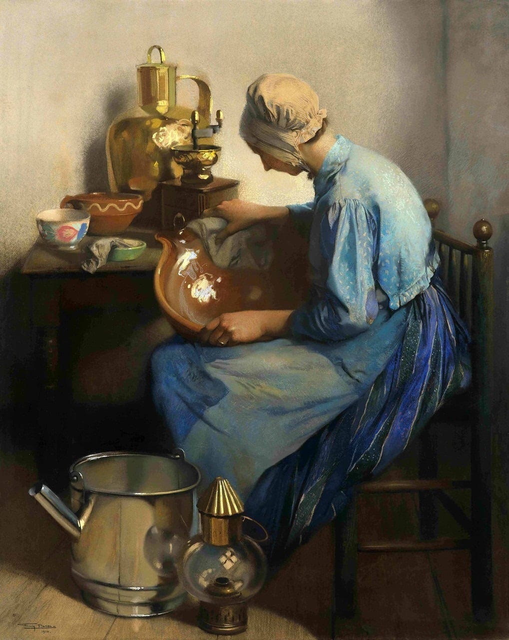 When I went wandering far from home, I left a woman in my room To clean my hearth and floor, and dust My shelves and pictures, books and bust. When I came back a welcome glow Burned in her eyes — her voice was low; And every thing was in its place, As clean and bright as her own face. But when I looked more closely there, The dust was on my dark, bronze hair; The nose and eyebrows too were white — And yet the lips were clean and bright. The years have gone, and so has she, But still the truth remains with me — How that hard mouth was once kept clean By living lips that kissed unseen. ══════════════════════════